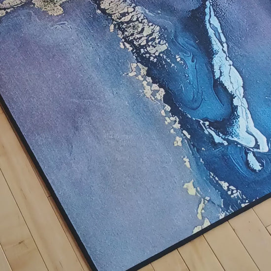 Step into a world of sophisticated elegance with this breathtaking abstract area rug that doubles as functional floor art. The mesmerizing blend of deep ocean blues, shimmering gold accents, and marble-inspired swirls creates a captivating focal point that elevates any room from ordinary to extraordinary.