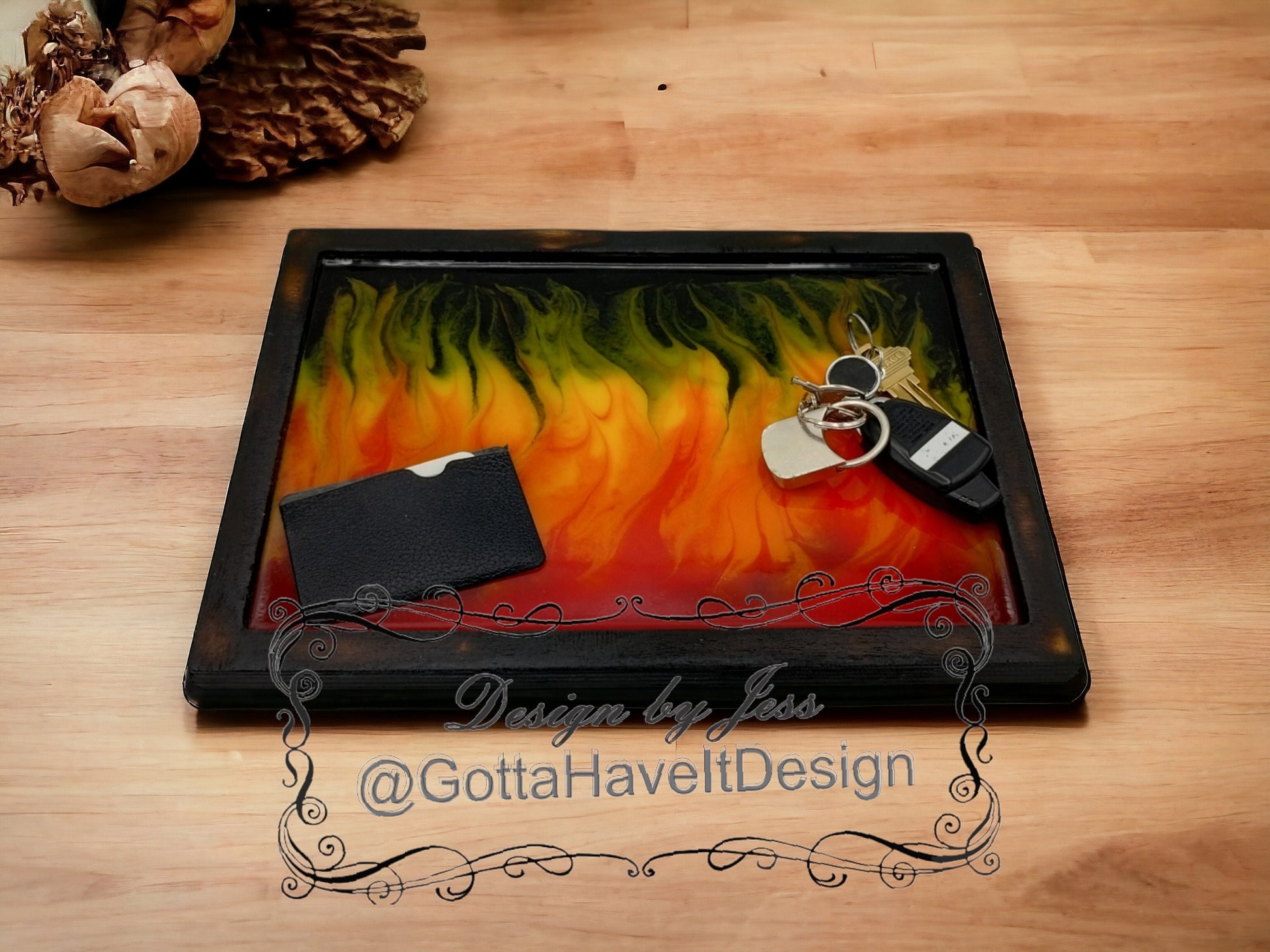This too hot to handle wood tray was burned and sealed on the bottom and edges. The epoxy center was hand poured and designed, (no two are the same). Small enough to accommodate many uses such as a spot to put your keys, wallet, remotes or even a rolling tray. Approximately 8" X 10 3/4" X 1/2" high.